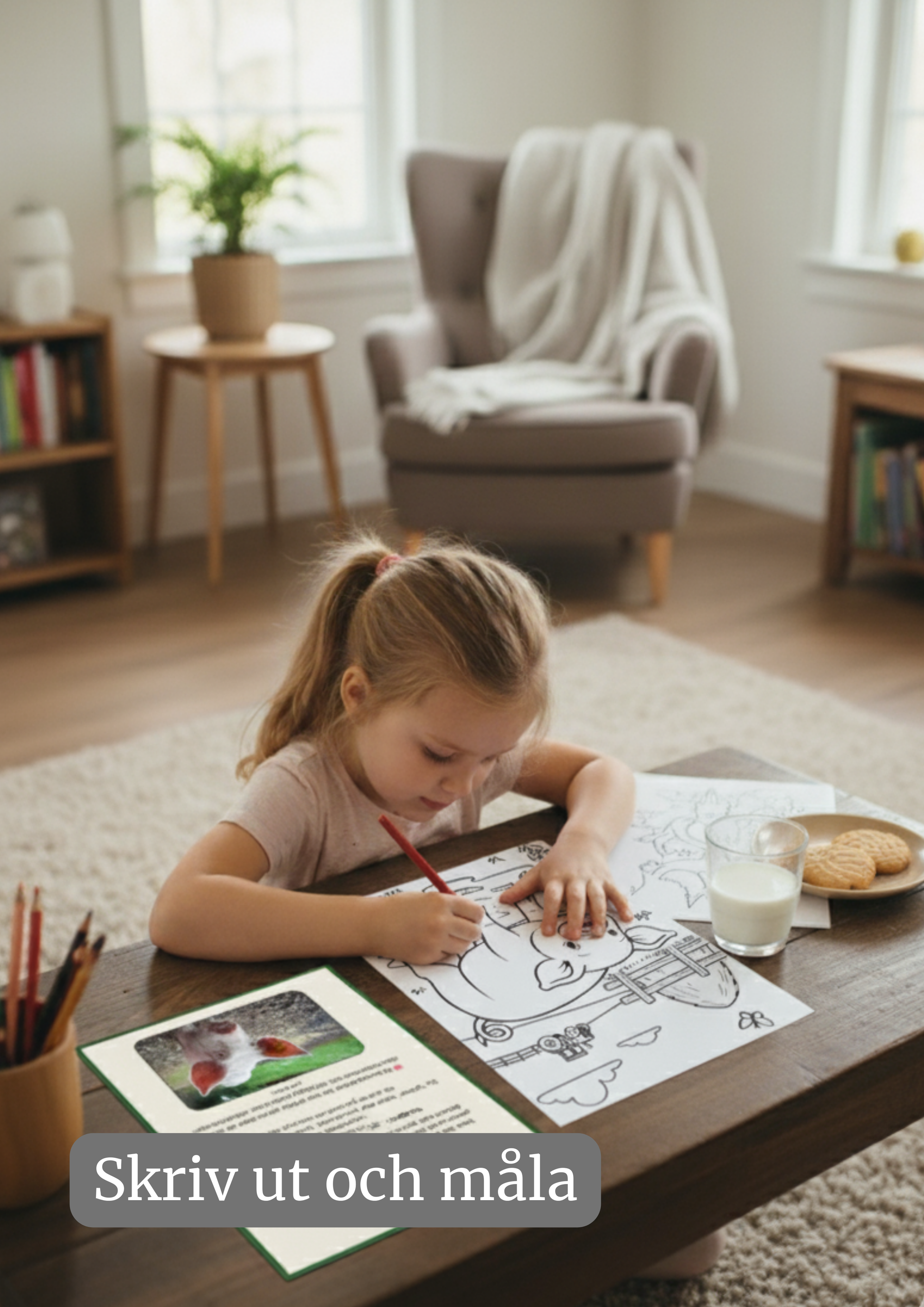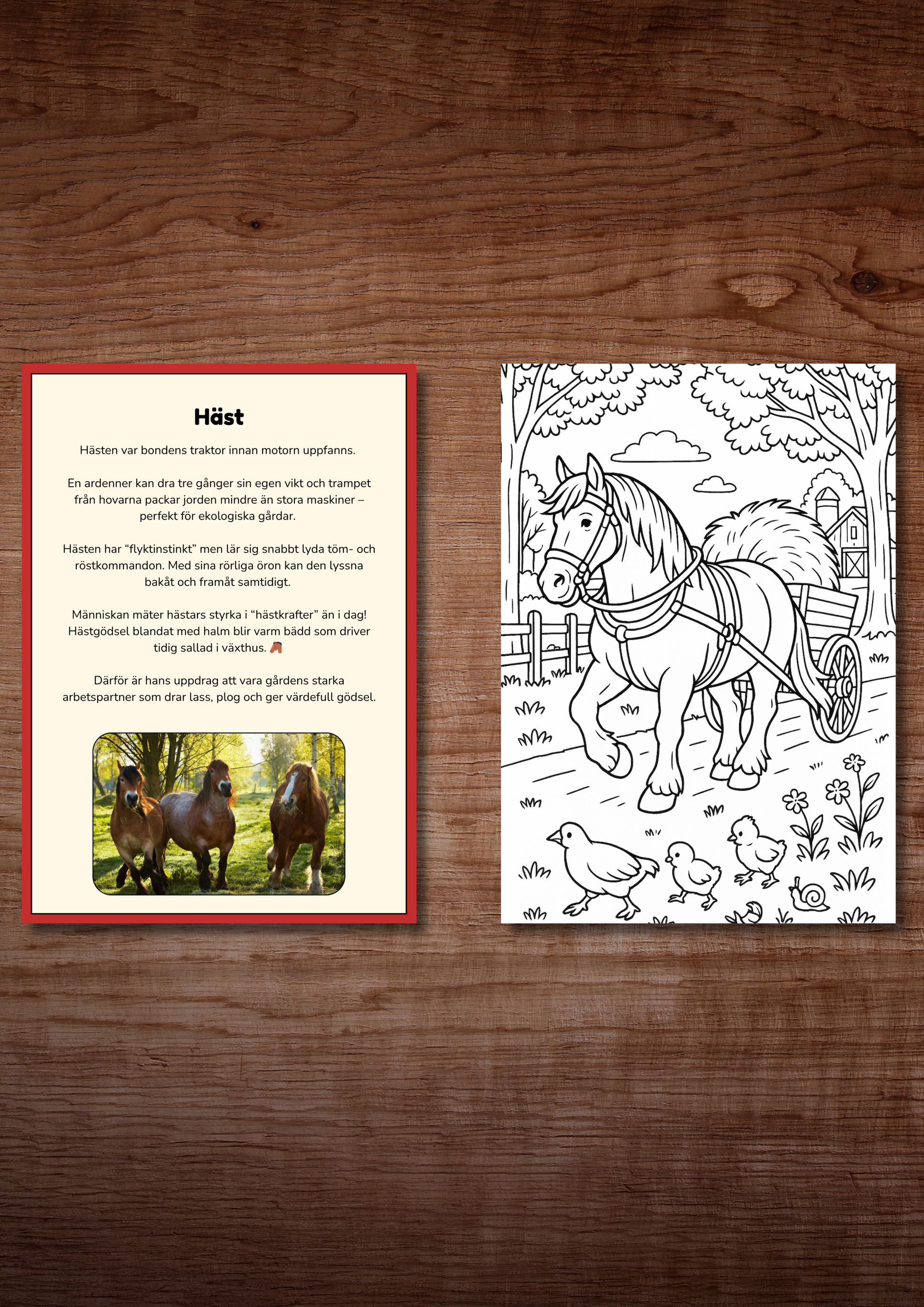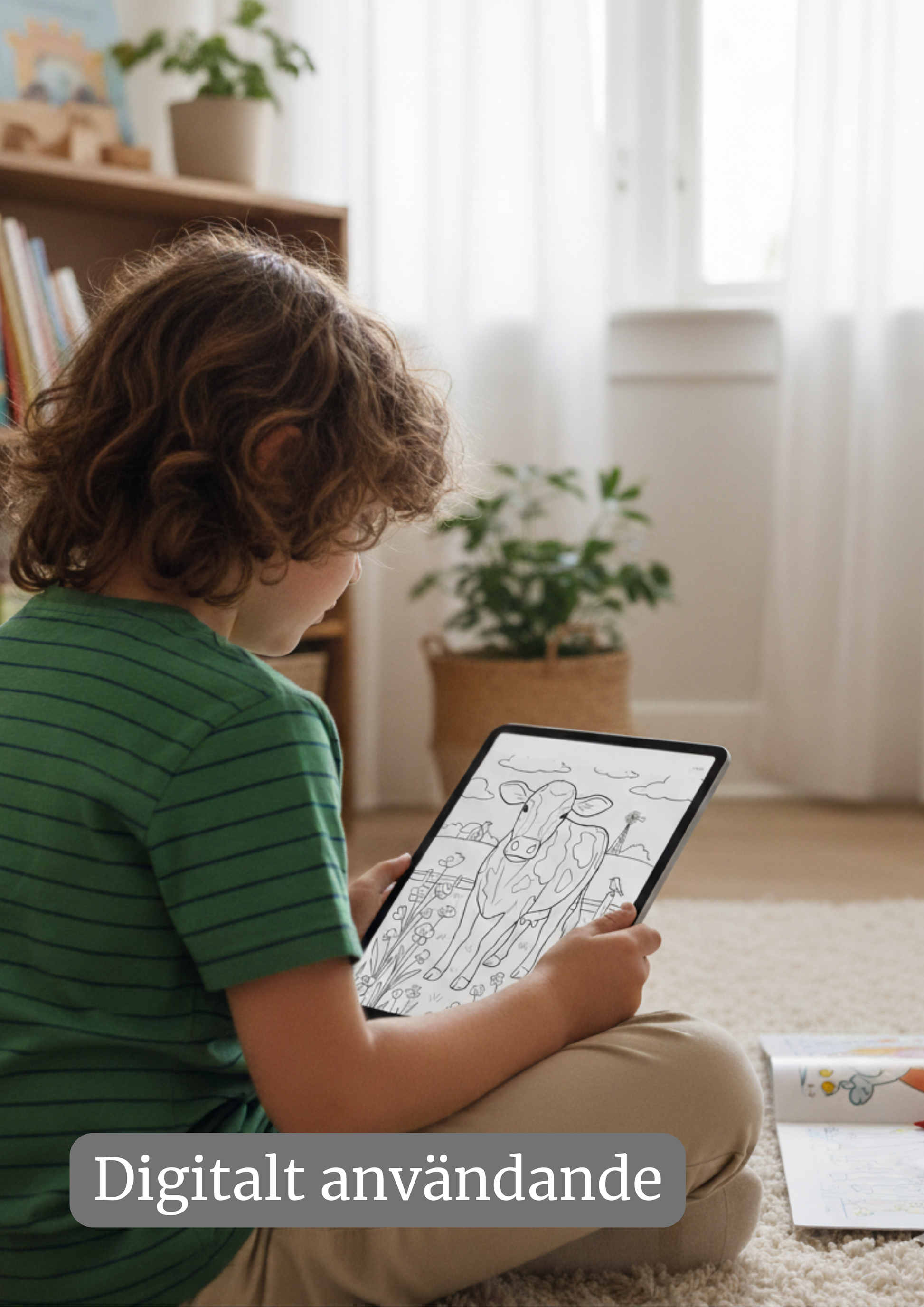 Här får de färglägga tolv olika bondgårdsdjur, som häst, ko, gris och kanin, samtidigt som de lär sig roliga fakta. Boken är anpassad för barn 4–10 år och levereras som PDF, redo att användas på surfplatta eller skrivas ut hemma.