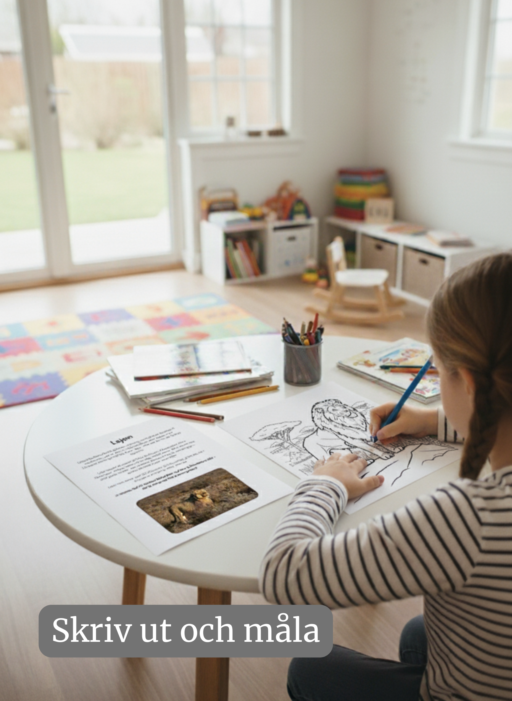 Vi använder materialet både på iPad och i utskriven version. Det är så snyggt upplagt: först en hel bild att färglägga, sedan en hel faktasida om djuret – perfekt för barn som är nyfikna. Min dotter älskar särskilt att läsa upp fakta för mig efter att hon färglagt. Det känns som att vi har hittat något som både är kul och utvecklande.
