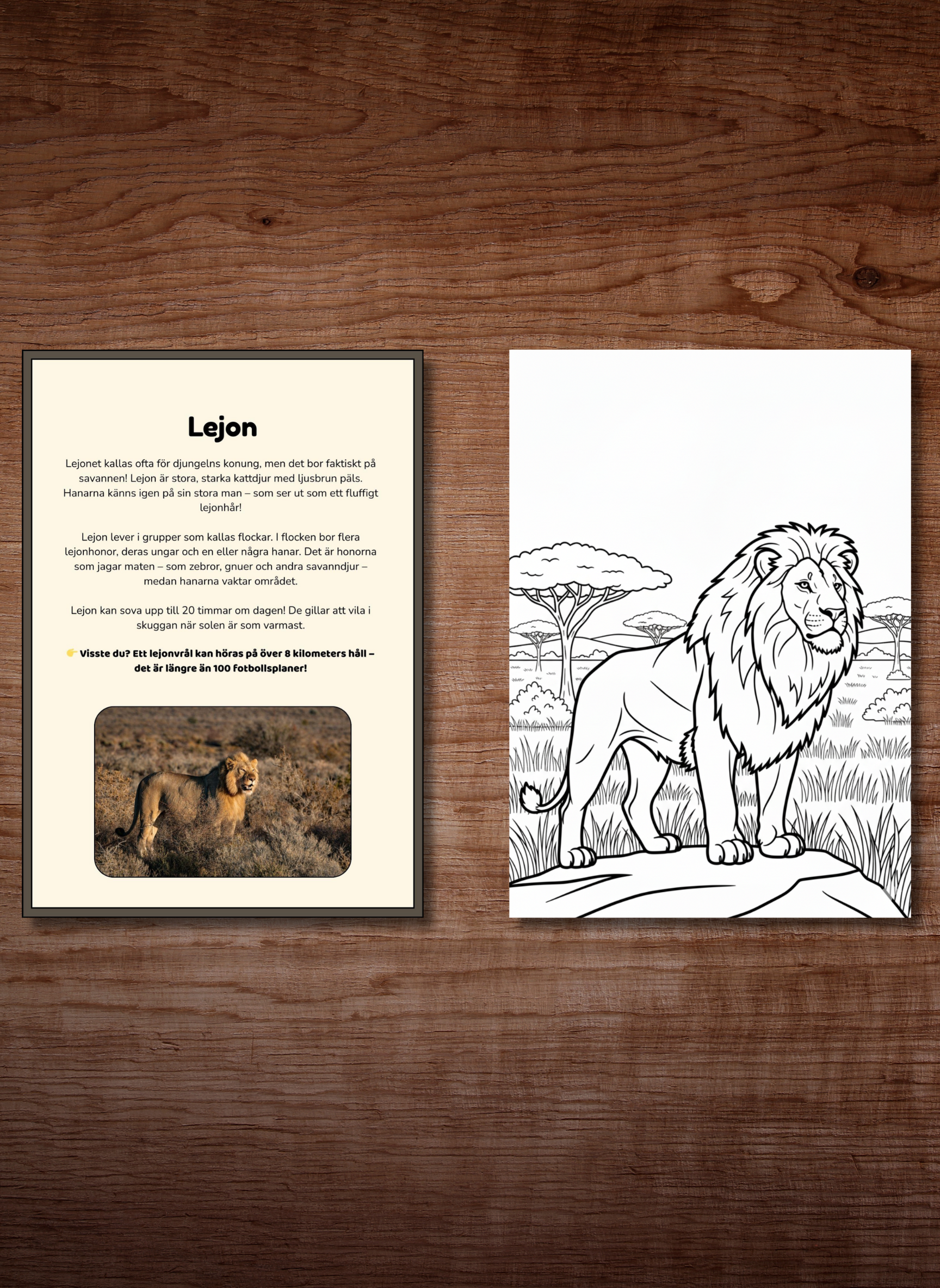 Jag blev så positivt överraskad över hur genomtänkt innehållet är. Det är inte bara en bild med lite text – varje djur har en hel sida med spännande fakta som verkligen fångar barnets intresse. Min dotter älskar att först färglägga och sen be mig läsa allt om djuret. Det blir ofta startskottet till jättefina samtal!