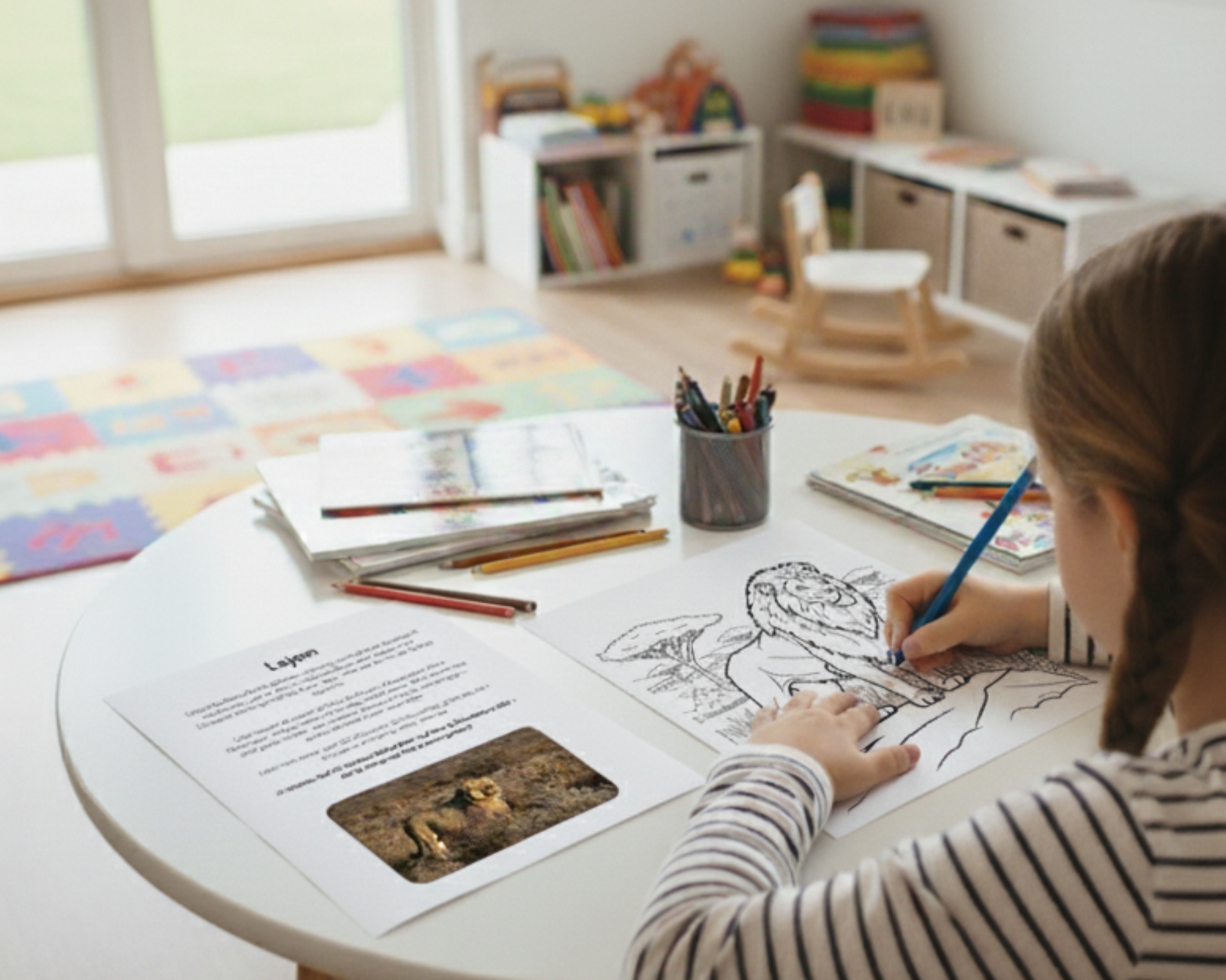 Här får de möta savannens djur, lejon, elefanter och flodhästar, samtidigt som de lär sig roliga fakta på ett enkelt och lekfullt sätt. Anpassad för barn 4–10 år och levereras som PDF, redo att färgläggas digitalt eller skrivas ut om och om igen.