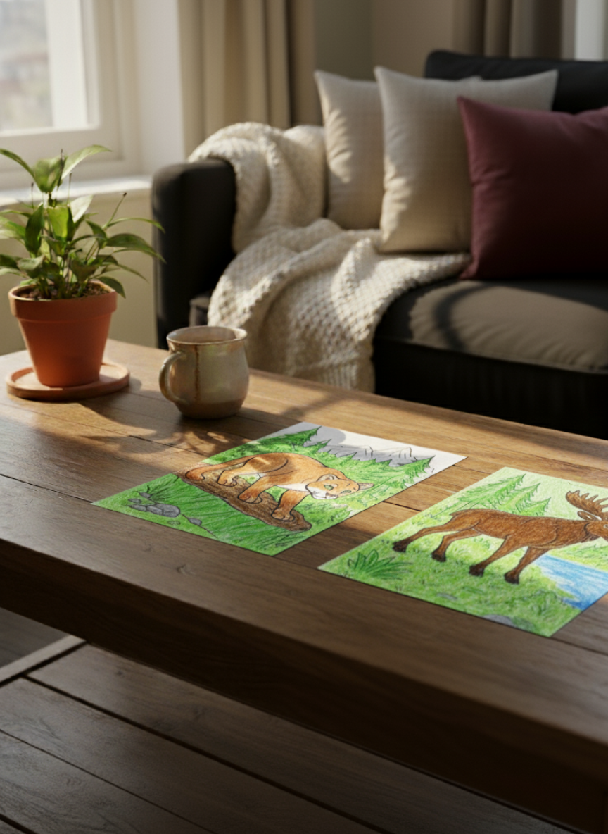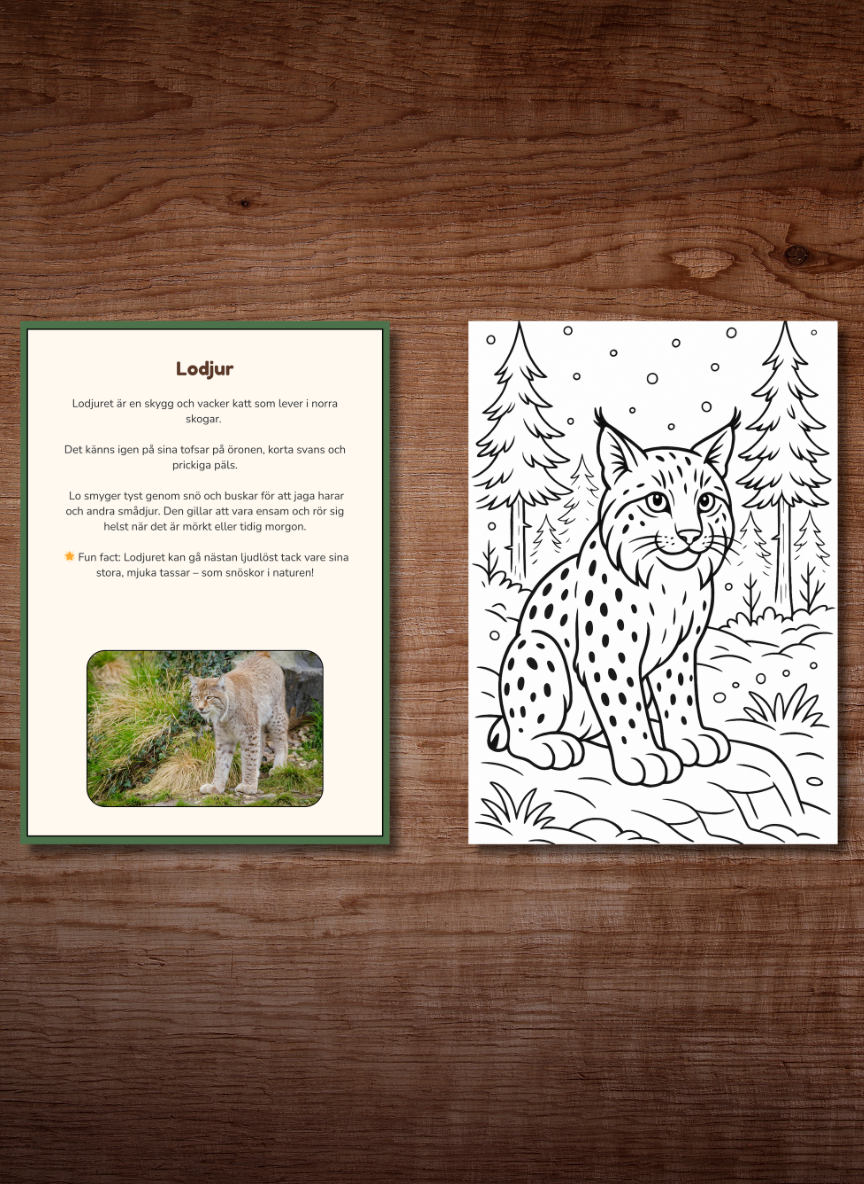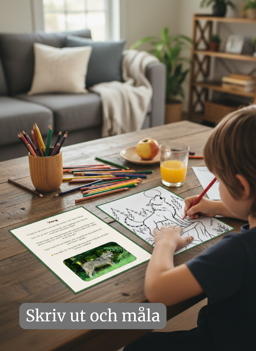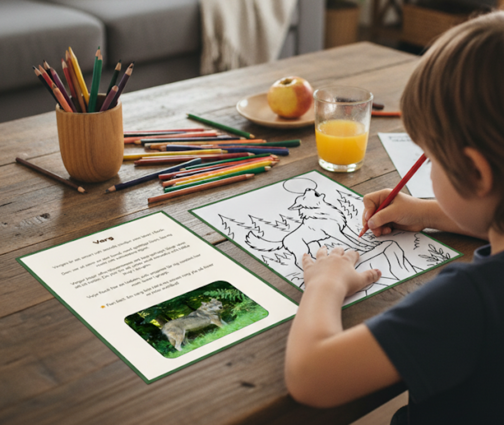 Här får de färglägga skogens djur, som rådjur, ugglor och rävar, samtidigt som de lär sig enkla fakta. Anpassad för barn 4–10 år och levereras som PDF, redo för både surfplatta och utskrift.